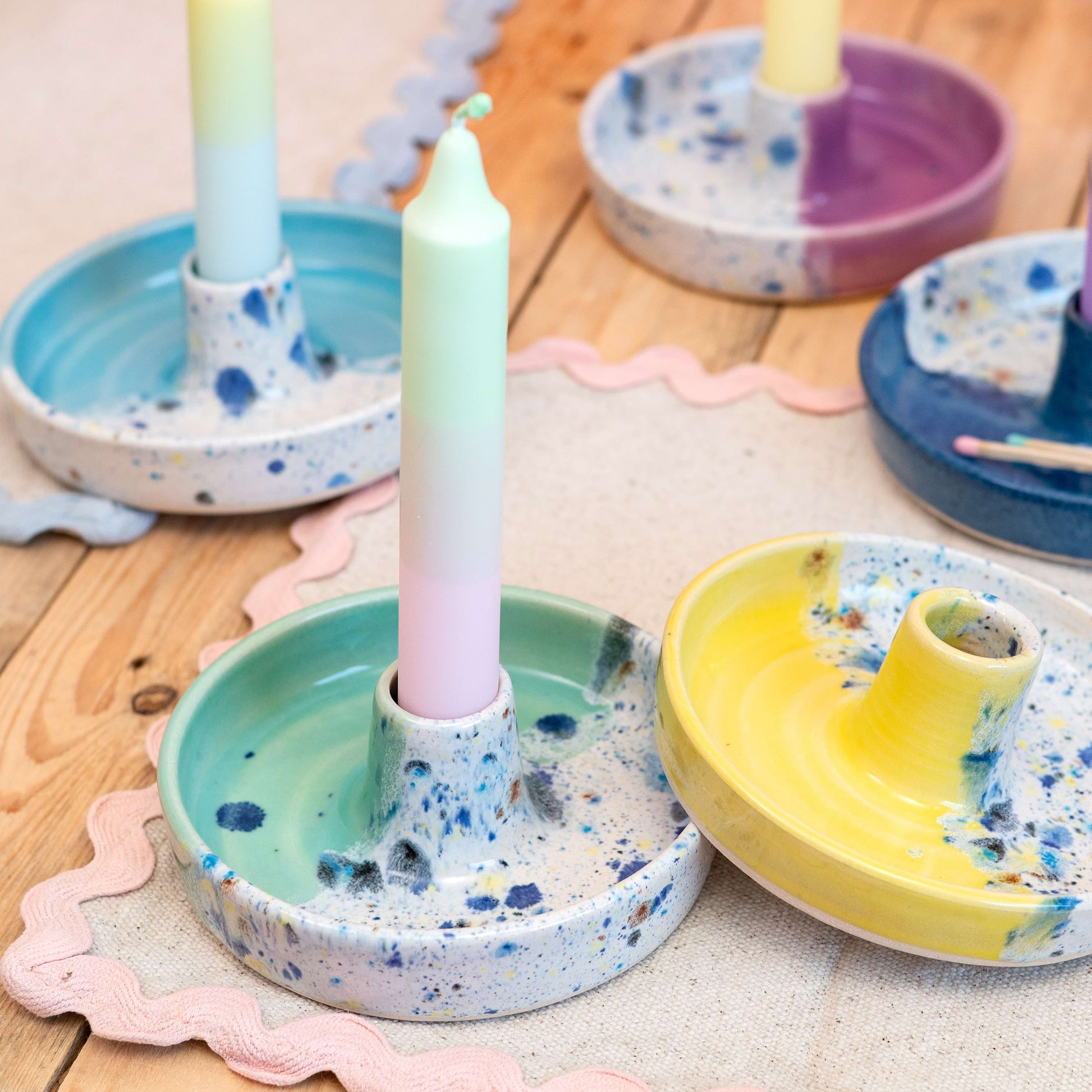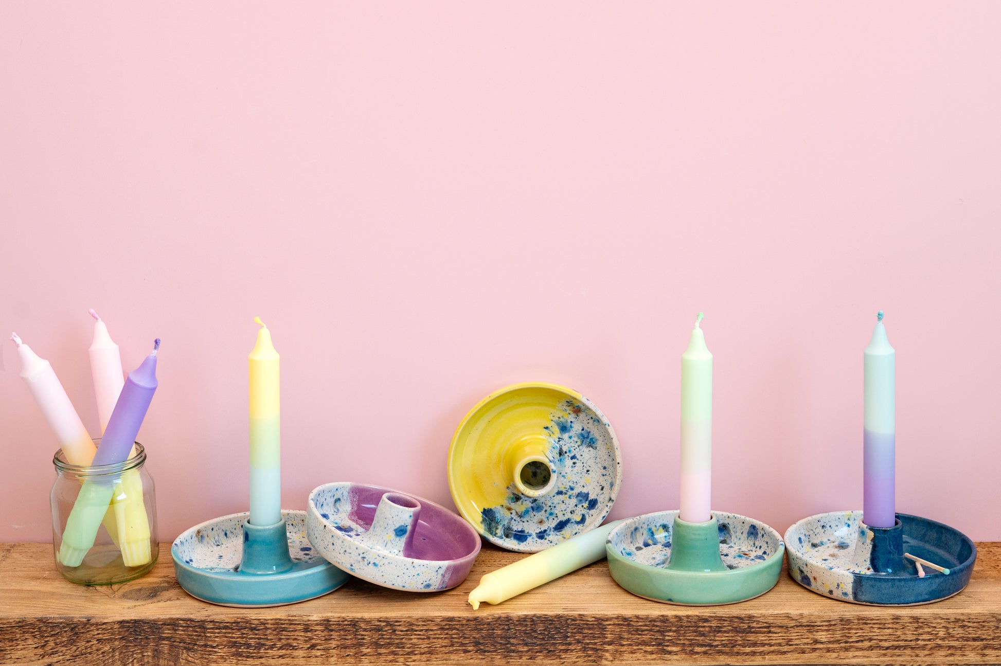Strong and sturdy, handmade and designed with a curved base to catch any wax drippage.