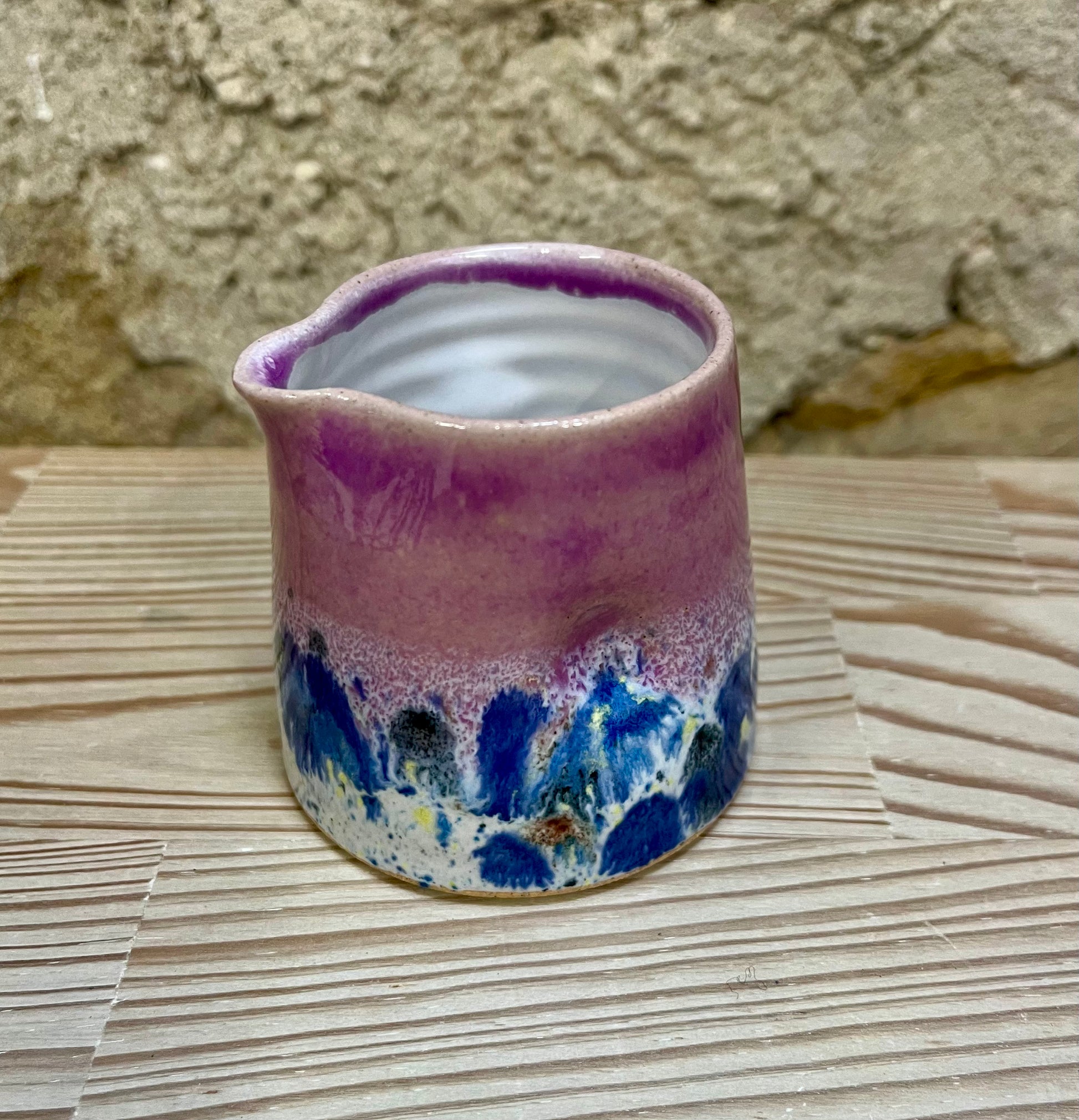Tiny jug, lots of charm. The perfect addition to a colourful breakfast set for milk or even an individual sauce pot. Wheel thrown and pinched for the perfect hold.